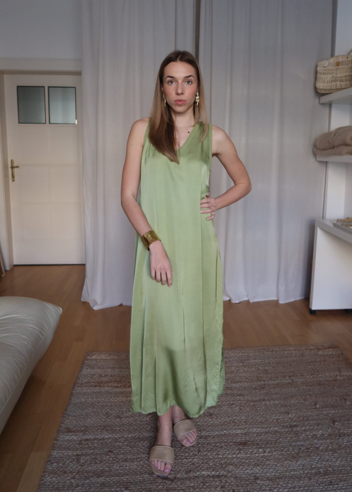V-čkový výstřih přidává šatům jemnou dávku sofistikovanosti, zatímco rozparky po bocích umožňují lehkost při chůzi. Vyrobeny z přírodního materiálu, šaty Athény jsou nejen luxusní na dotek, ale také šetrné k pokožce.