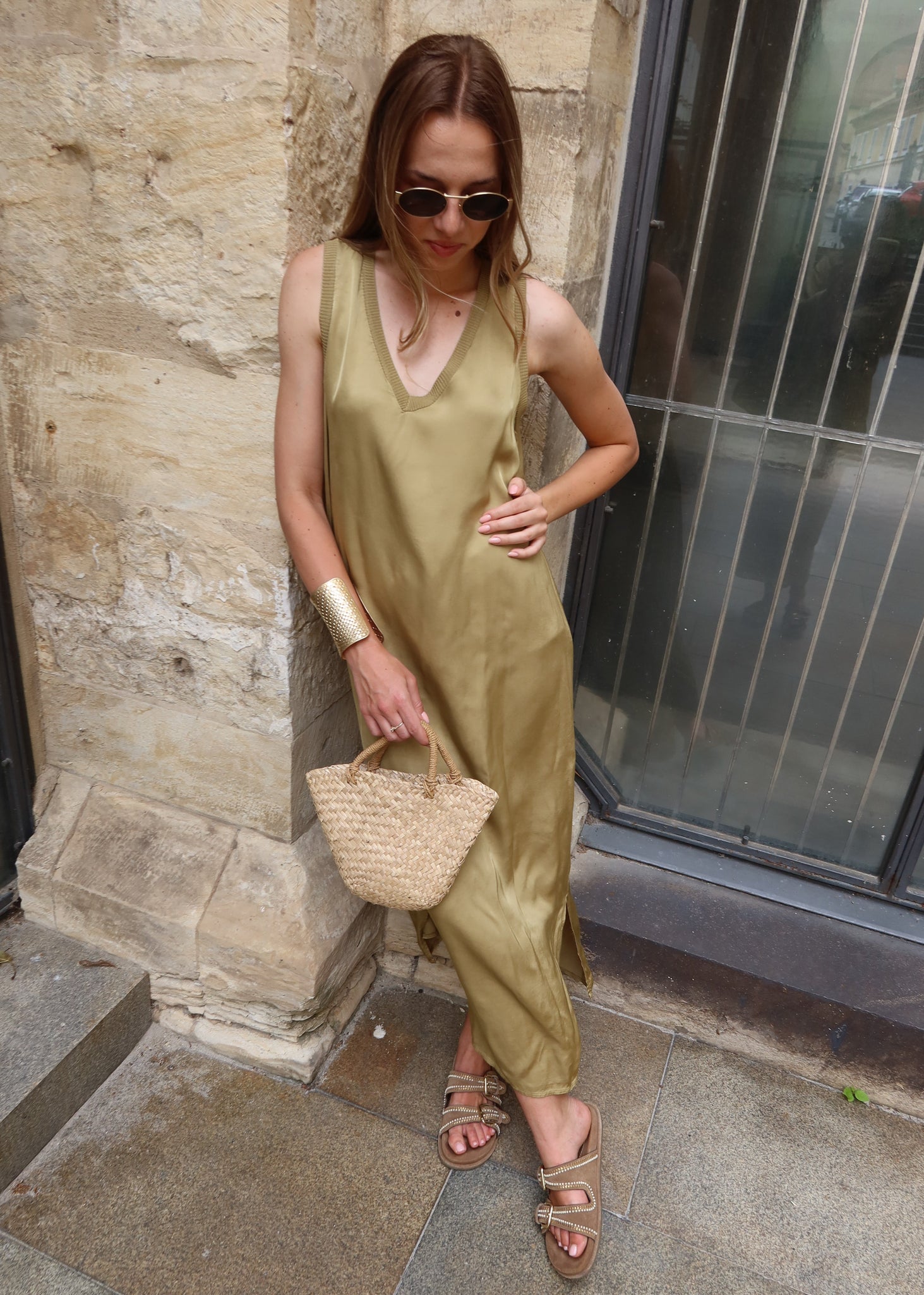V-čkový výstřih přidává šatům jemnou dávku sofistikovanosti, zatímco rozparky po bocích umožňují lehkost při chůzi. Vyrobeny z přírodního materiálu, šaty Athény jsou nejen luxusní na dotek, ale také šetrné k pokožce.