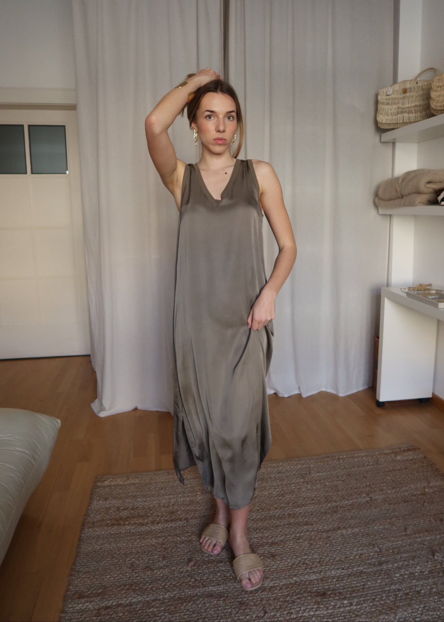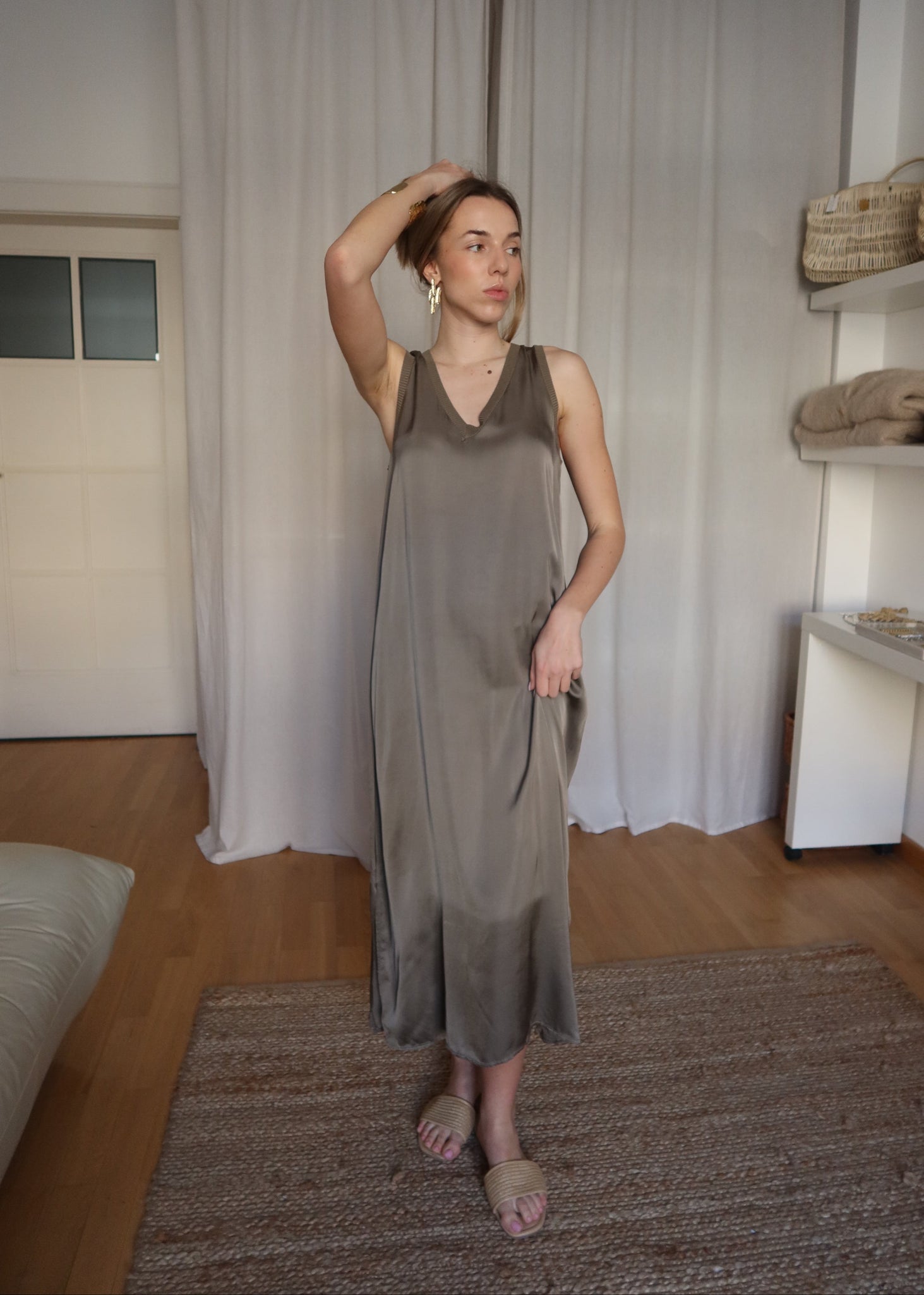V-čkový výstřih přidává šatům jemnou dávku sofistikovanosti, zatímco rozparky po bocích umožňují lehkost při chůzi. Vyrobeny z přírodního materiálu, šaty Athény jsou nejen luxusní na dotek, ale také šetrné k pokožce.