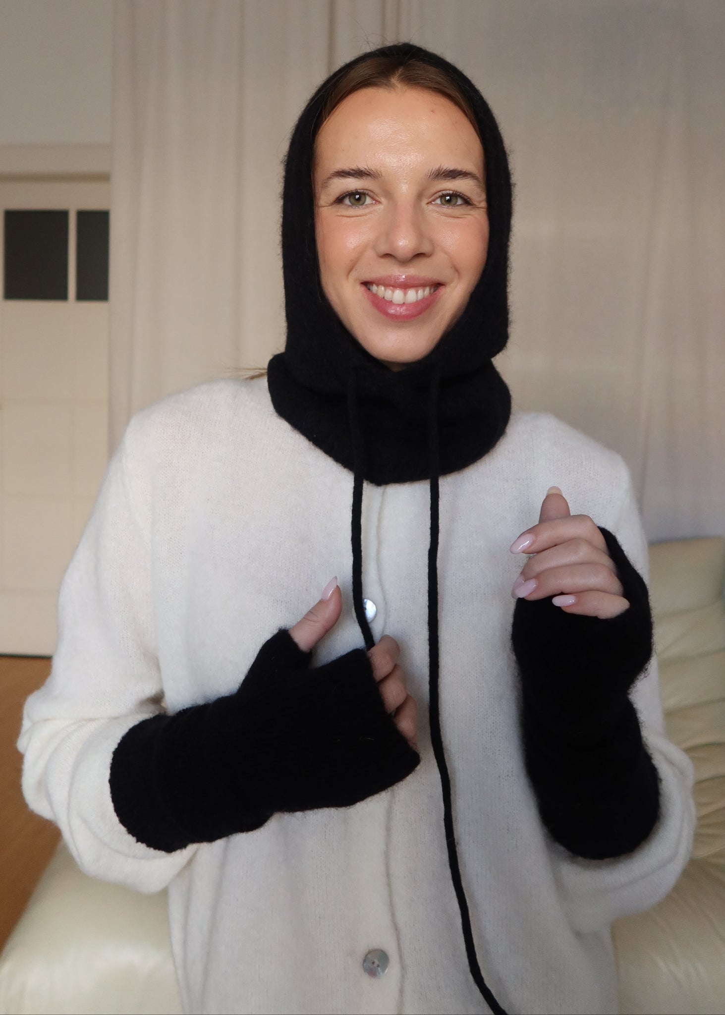 Měkoučká balaclava z baby alpaky a dlouhé alpaka rukavice bez prstů, které zahřejí, nezatěžují a dodají vašemu zimnímu outfitu styl i pohodlí.