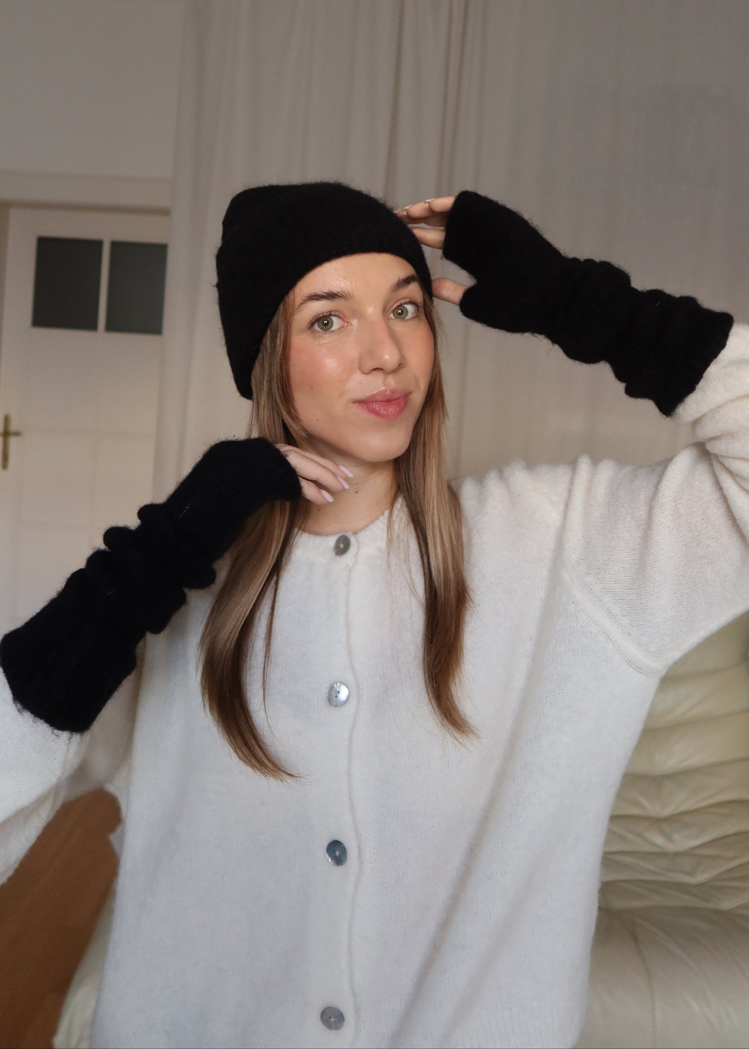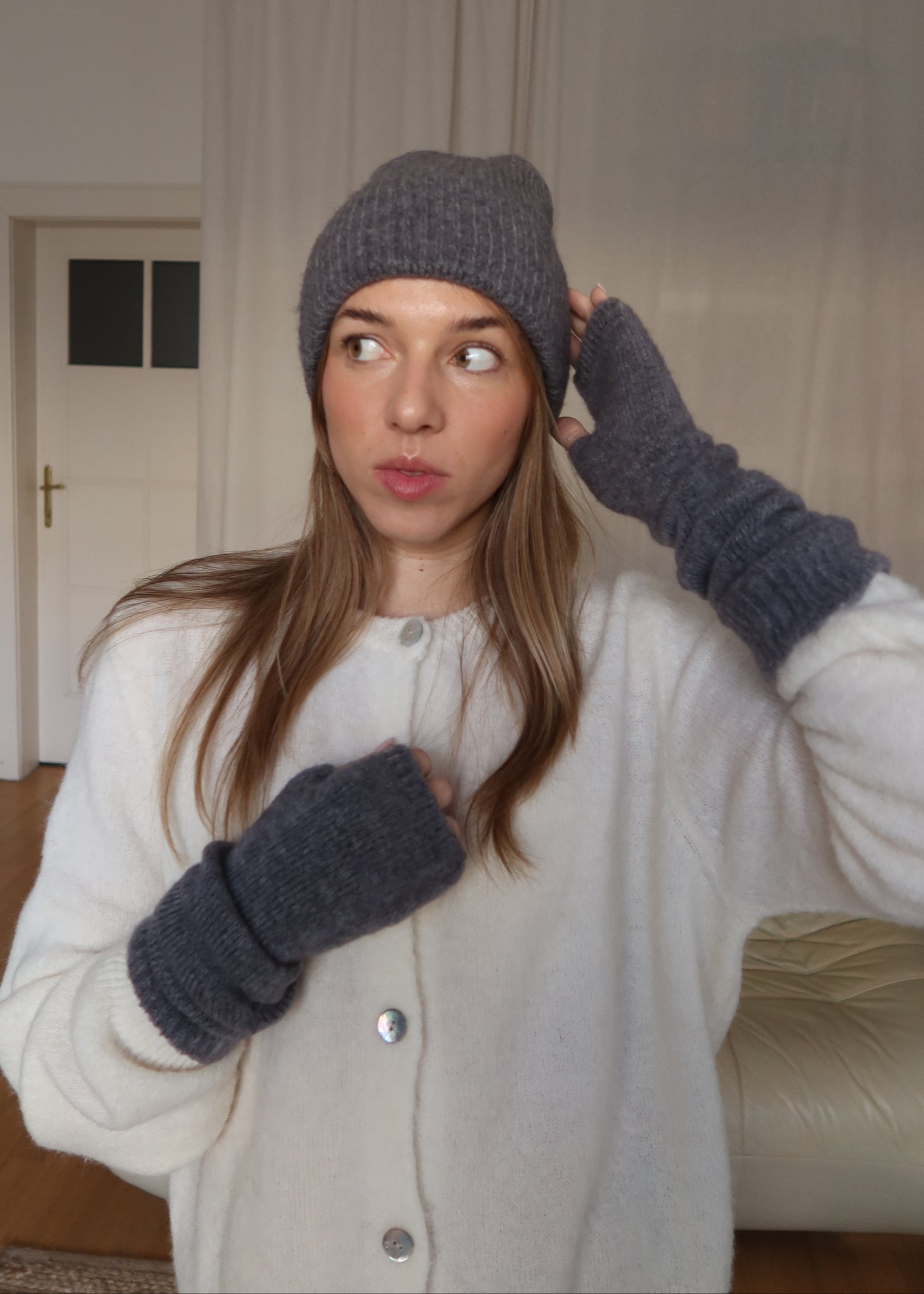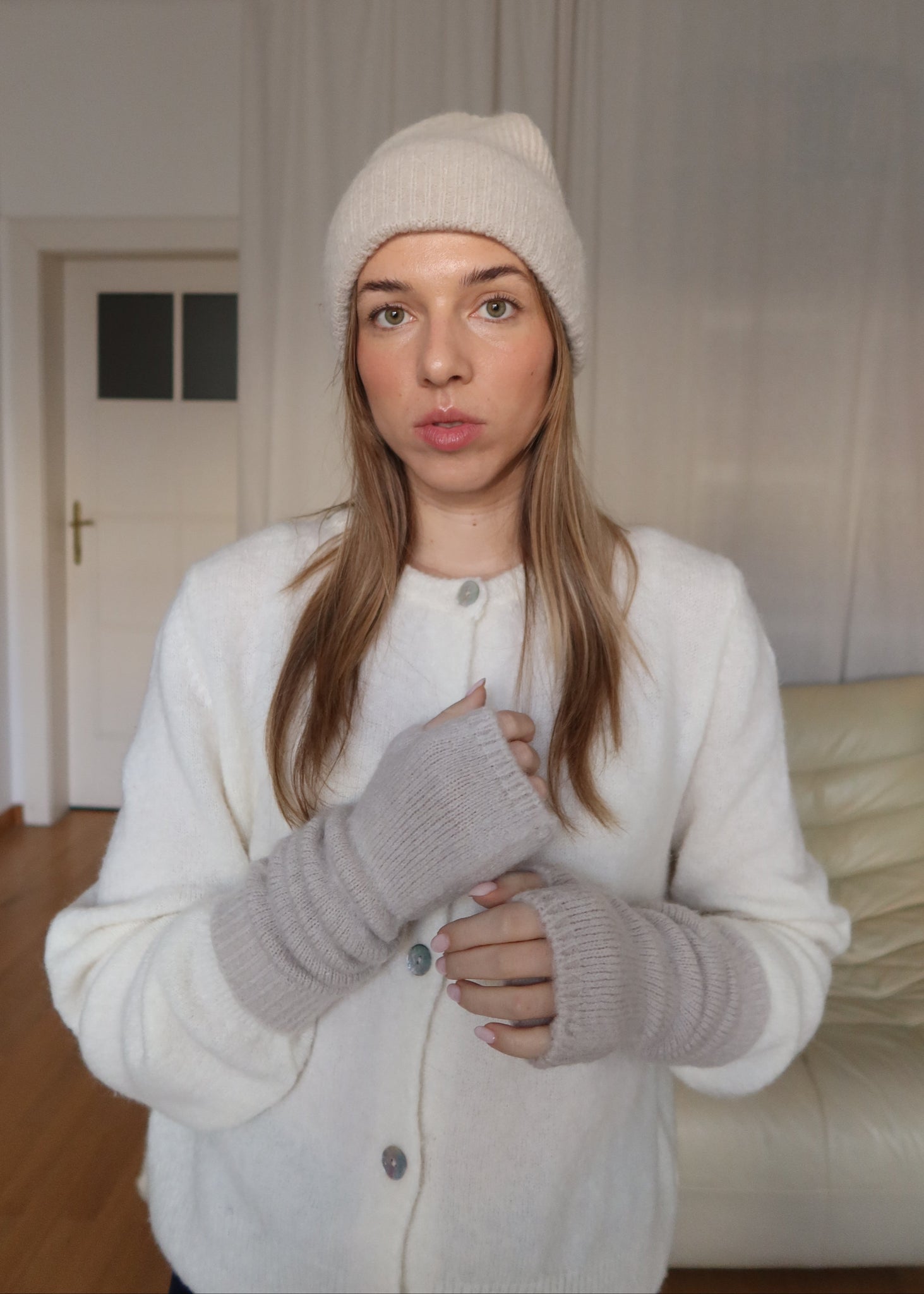 Měkoučká čepice z baby alpaky a dlouhé alpaka rukavice bez prstů, které zahřejí, nezatěžují a dodají vašemu zimnímu outfitu styl i pohodlí.