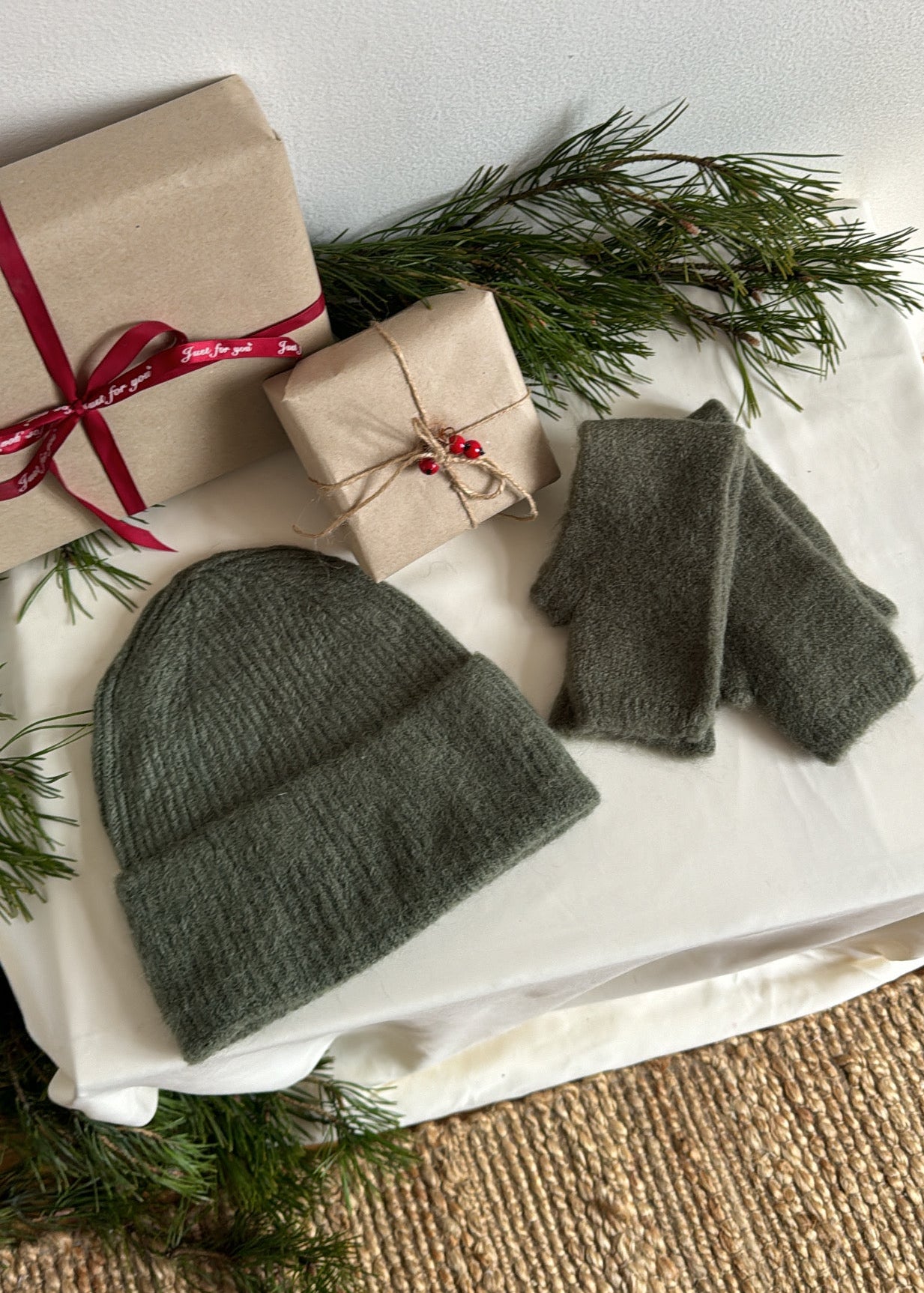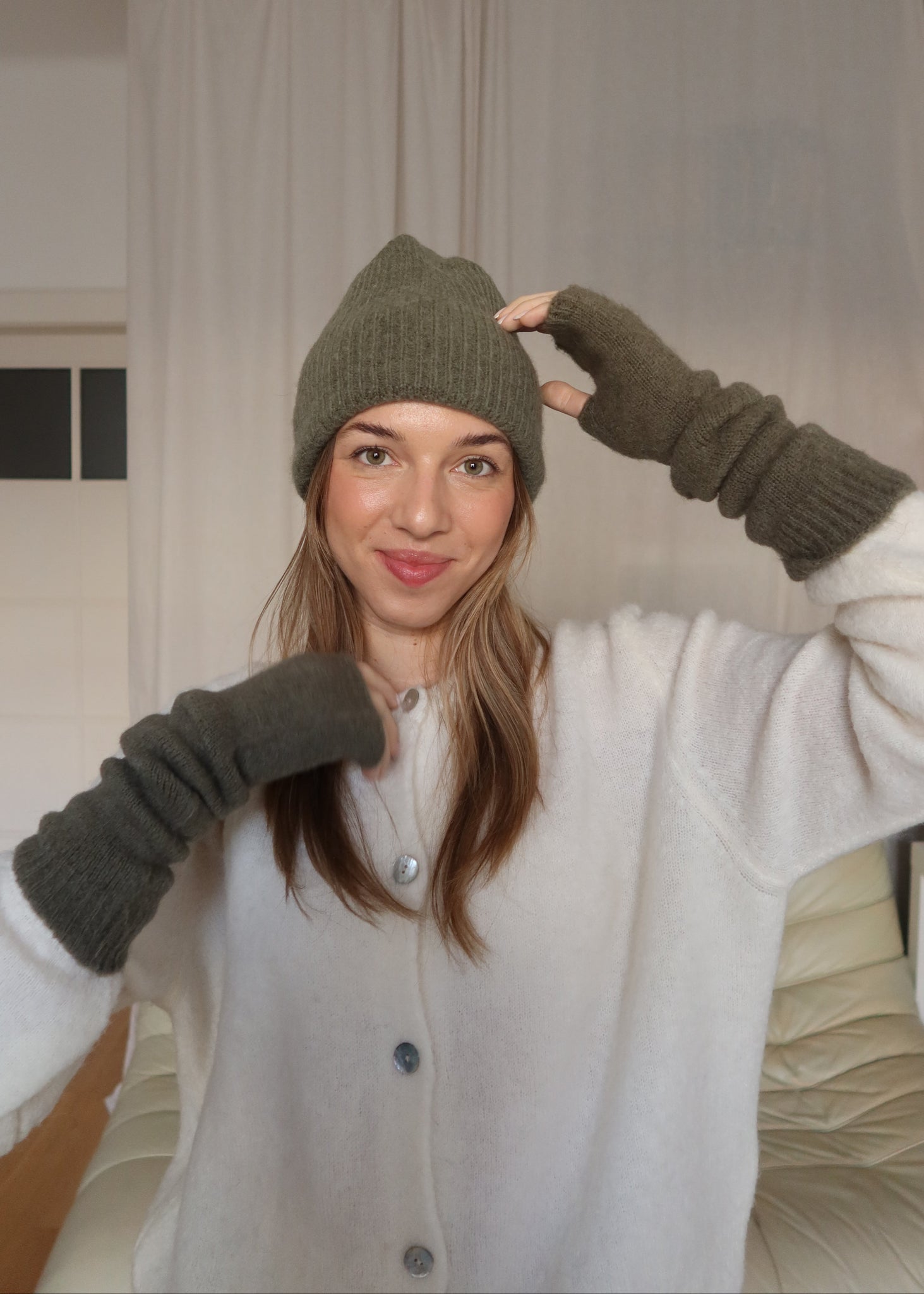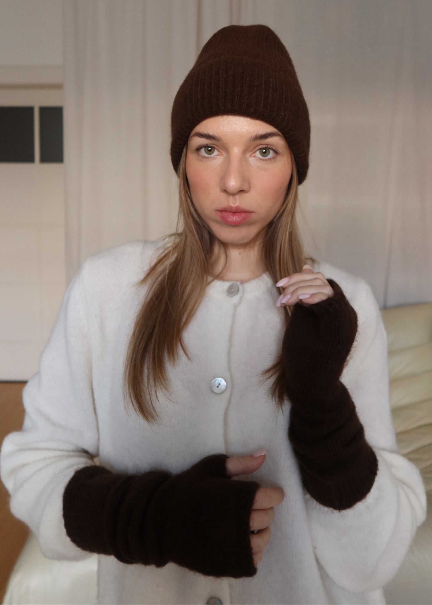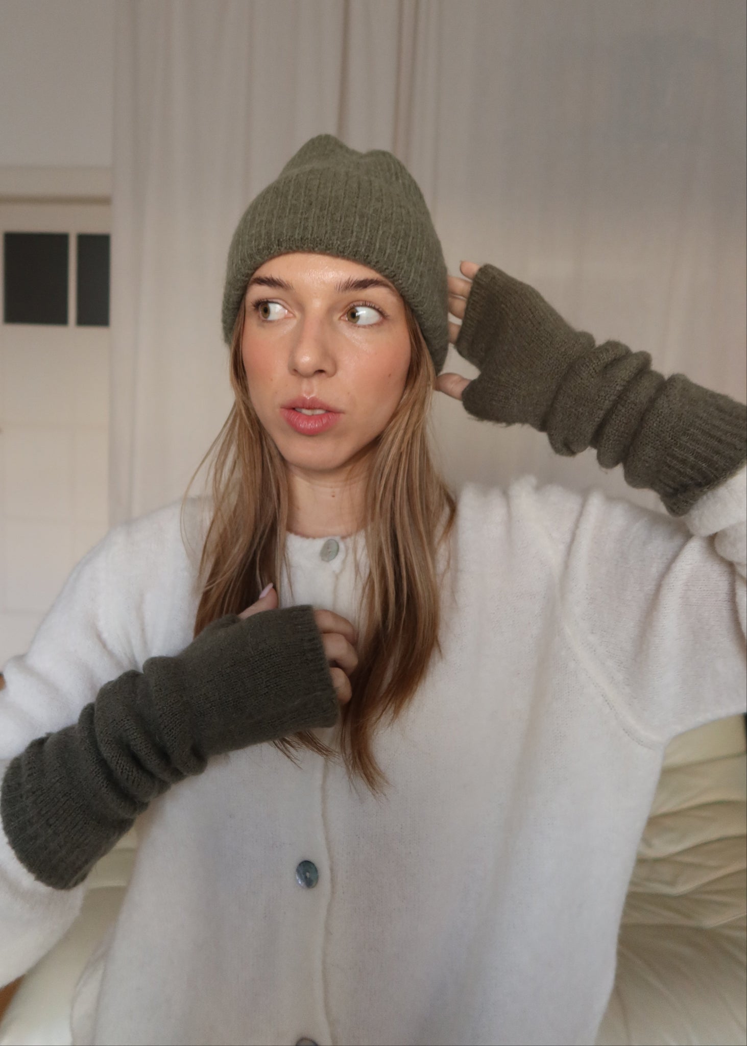 Měkoučká čepice z baby alpaky a dlouhé alpaka rukavice bez prstů, které zahřejí, nezatěžují a dodají vašemu zimnímu outfitu styl i pohodlí.
